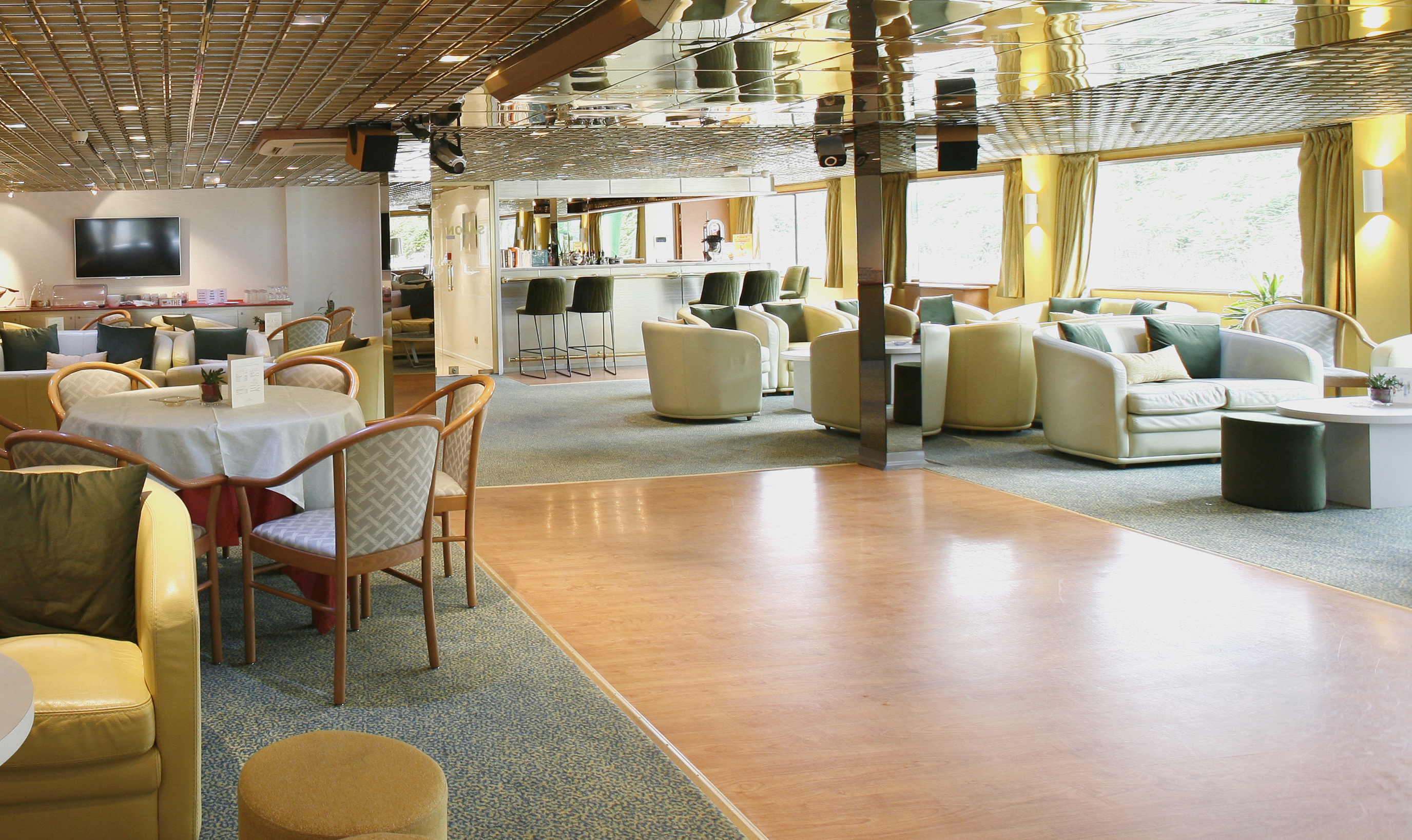 The lounge tastefully decorated, is located at the front of the ship and offers panoramic views. Cocktails and games, dancing, and other forms of entertainment all happen here.