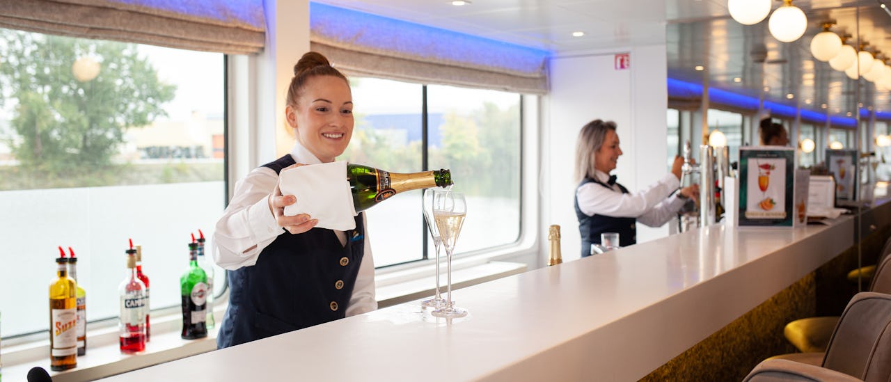 Located on the middle deck, with a panoramic view, the restaurant is where all meals are served during your cruise. The atmosphere is casual but elegant.