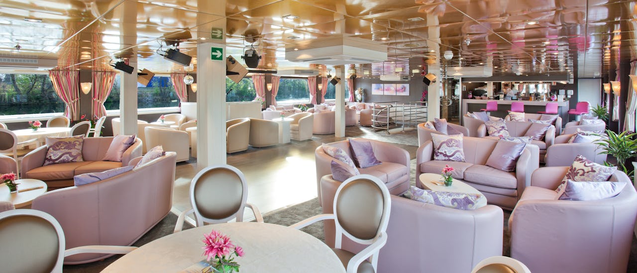 The lounge tastefully decorated, is located at the front of the ship and offers panoramic views. Cocktails and games, dancing, and other forms of entertainment all happen here.