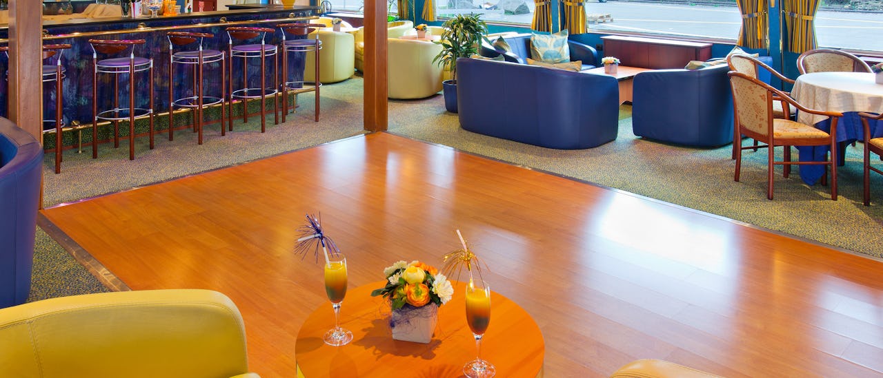 The tastefully decorated lounge, is located at the front of the ship and offers panoramic views. Cocktails and games, dancing, and other forms of entertainment all happen here.
