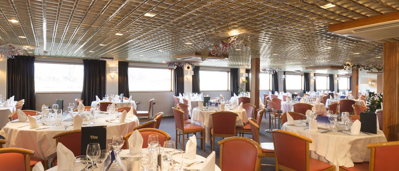 The main restaurant is located on the main deck and is where all meals are served. It seats all guests at tables which vary in size with a panoramic view. The atmosphere is casual but elegant.