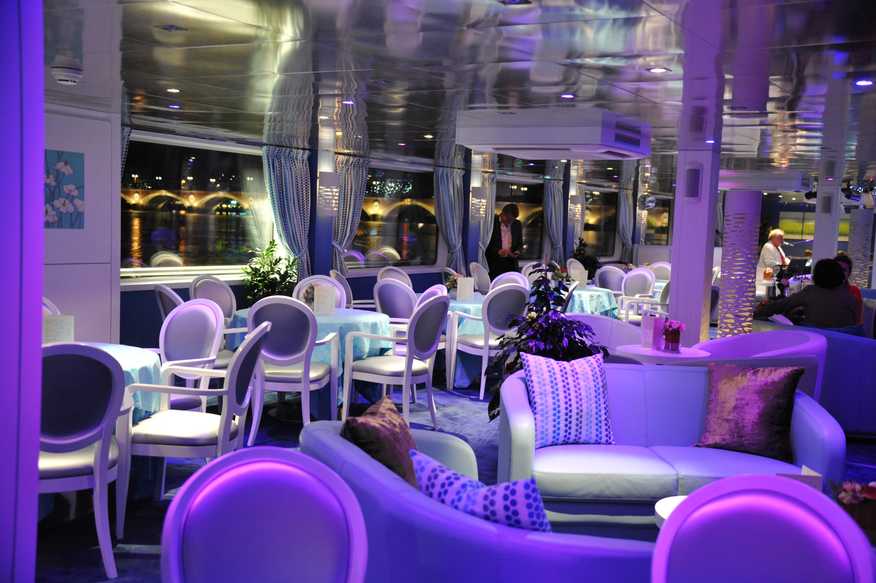 The tastefully decorated lounge is situated at the front of the ship and provides panoramic views. Here, you can enjoy cocktails, play games, dance, and partake in various forms of entertainment.