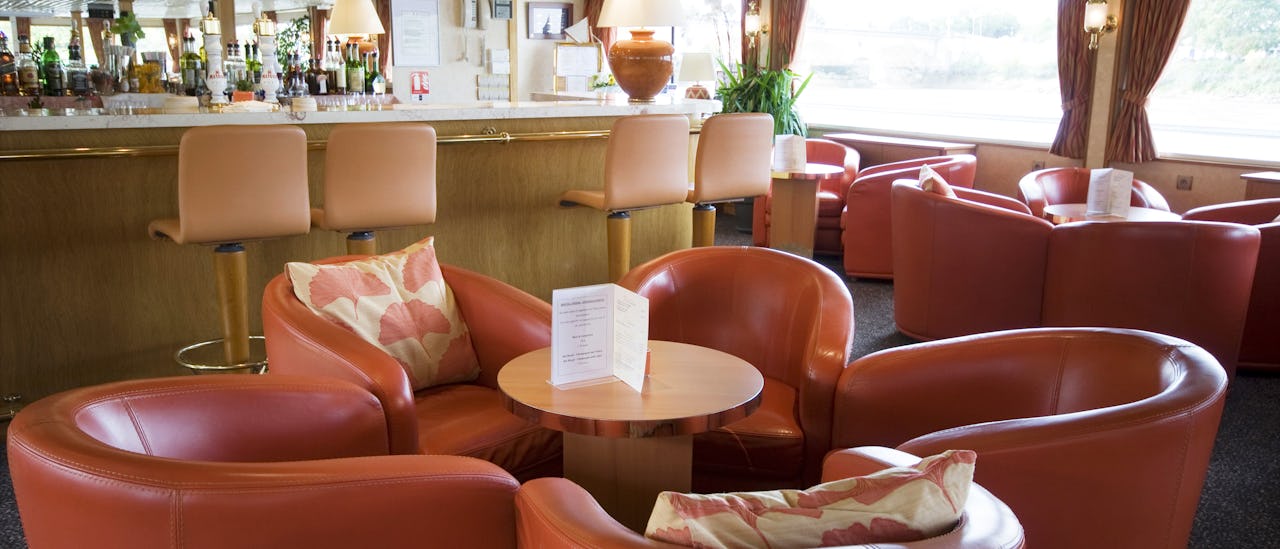 The lounge tastefully decorated, is located at the front of the ship and offers panoramic views. Cocktails and games, dancing, and other forms of entertainment all happen here.