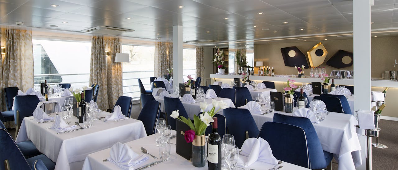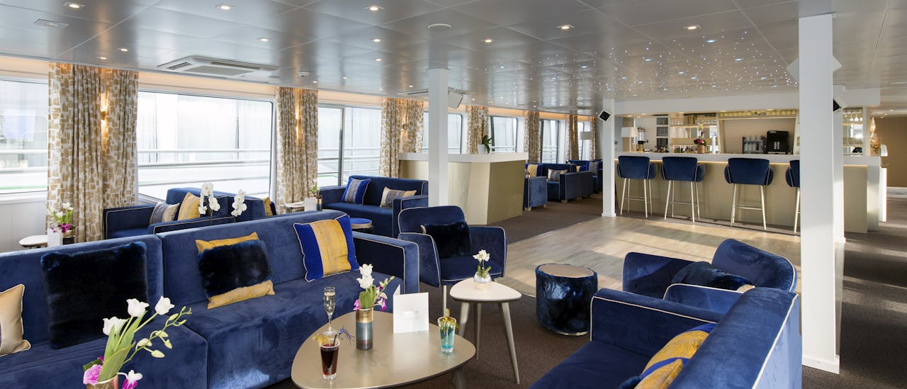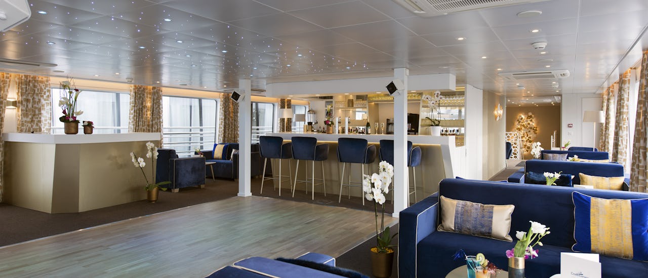 The lounge tastefully decorated, is located at the front of the ship and offers panoramic views. Cocktails and games, dancing, and other forms of entertainment all happen here.