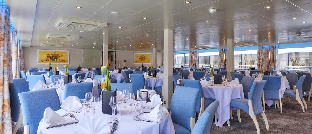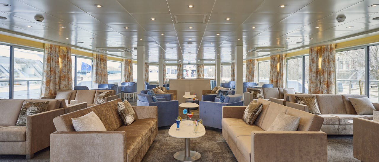 Located on the upper deck, the restaurant is where all meals are served during your cruise. It seats all guests at tables which vary in size with a panoramic view. The atmosphere is casual but elegant