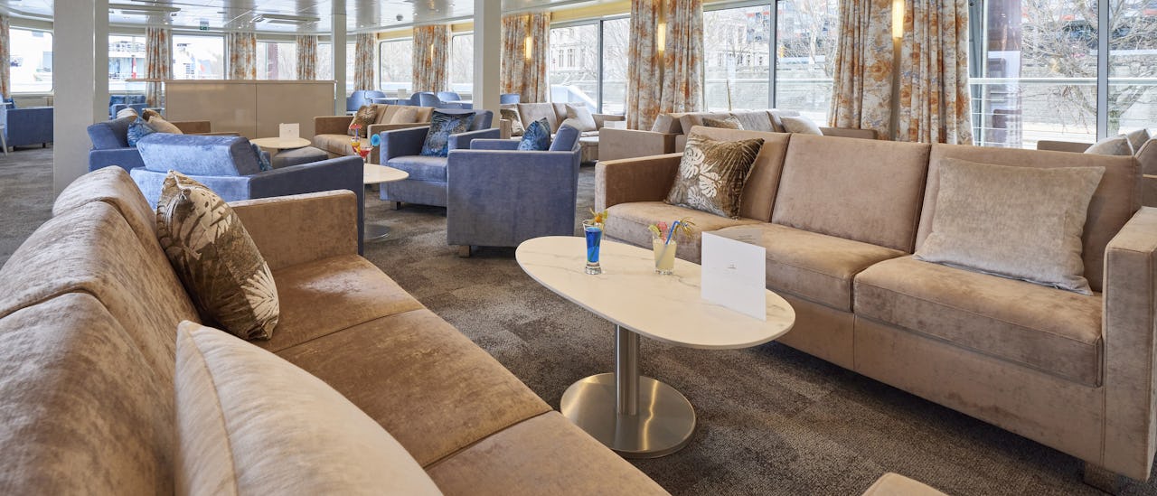 The elegantly adorned lounge, positioned at the ship's bow, provides sweeping panoramic vistas. It serves as the vibrant hub for cocktails, games, dancing, and various forms of entertainment.