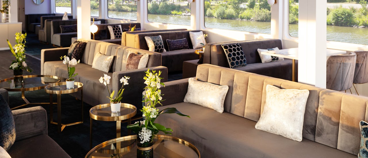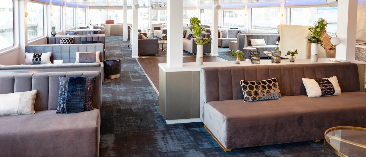 The lounge tastefully decorated, is located at the front of the ship and offers panoramic views. Cocktails and games, dancing, and other forms of entertainment all happen here.