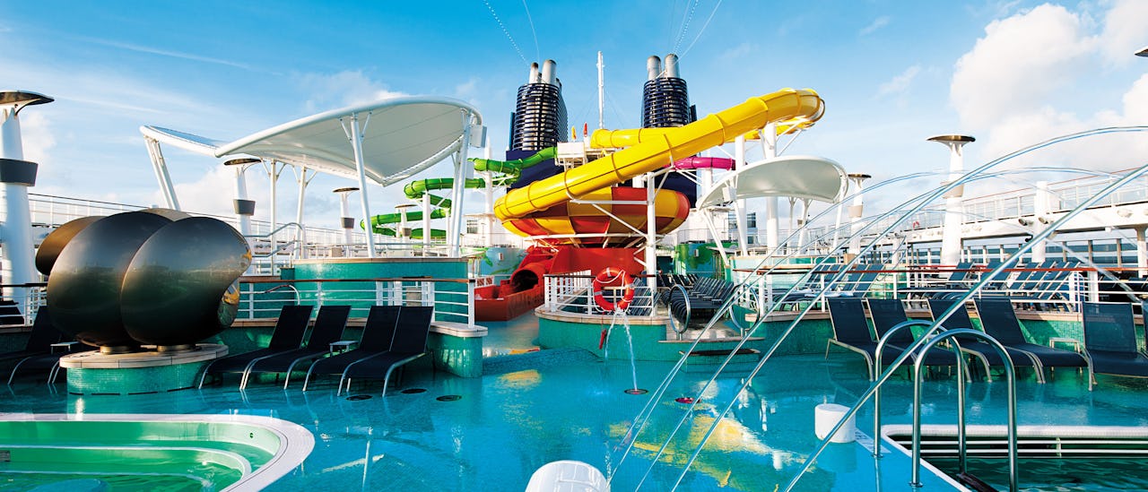 Experience wonderful sea views from a wide range of pools, spa and gym at the top of the ship.