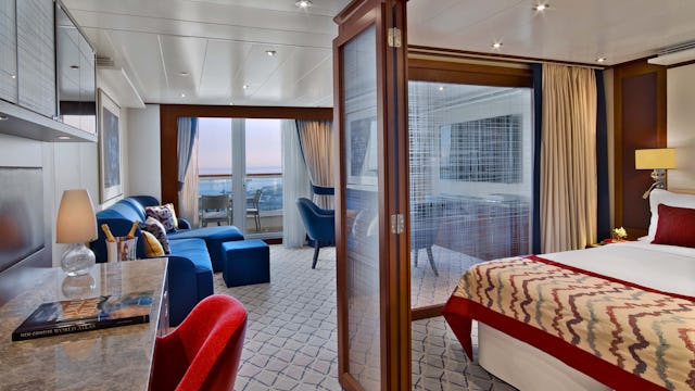 Seabourn's Penthouse Suites provide an elevated level of luxury and spaciousness, featuring a separate bedroom and a private veranda accessed through a glass door. The suite includes a dining area for two to four guests, a comfortable living space, and two flat-screen TVs. The fully stocked bar and refrigerator cater to your preferences, while the marble bathroom offers double vanities, a full-size tub, and a separate shower, ensuring a refined and comfortable experience.