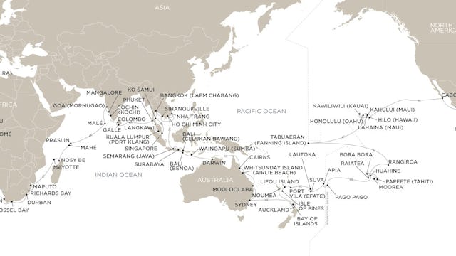 3 Oceans Cruised | 15 Seas, Straits, Gulfs, Bays & Channels Cruised | 6 Continents | 41 Countries | 77 Ports of Call | 16 Overnight Stays | 47 UNESCO World Heritage Sites | 431 Included Shore Excursions | 39,722 Nautical Miles Sailed