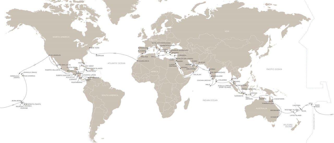 3 OCEANS CRUISED | 16 SEAS, STRAITS, GULFS, BAYS & CHANNELS CRUISED | 6 CONTINENTS | 40 COUNTRIES | 71 PORTS OF CALL | 14 OVERNIGHT STAYS | 61 UNESCO WORLD HERITAGE SITES | 486 INCLUDED SHORE EXCURSIONS | 35,668 NAUTICAL MILES SAILED