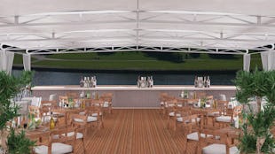 The top deck offers stunning views and is divided into relaxation and activity zones. Enjoy sun loungers for relaxation and engage in special events like stargazing and movie nights. For a change of pace, explore the activity area with games like minigolf, cornhole, shuffleboard, giant chess, and giant Connect Four.