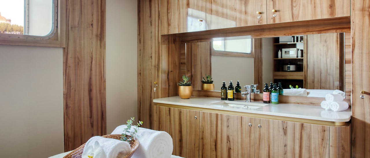 Comfortable, shaded couches and an outdoor pool give you the ultimate spot to take in the Portuguese sun and the incredible landscapes of the Douro River Valley from a unique vantage point while sailing.