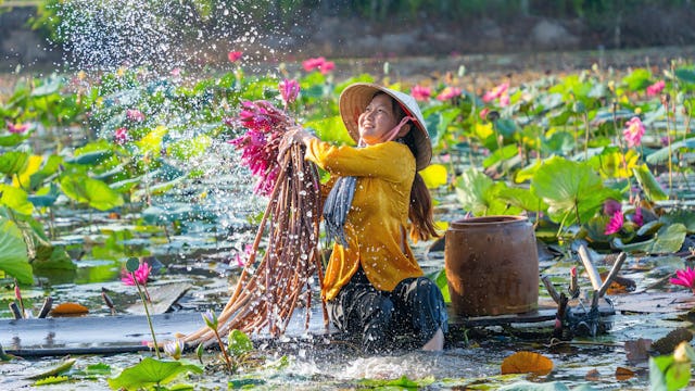 In Hồng Ngự, watch the local scarf weaving process before exploring this captivating island town by foot. Visit a verdant village in Mỹ An Hưng, where a local family will invite you in for honey tea and fruit.